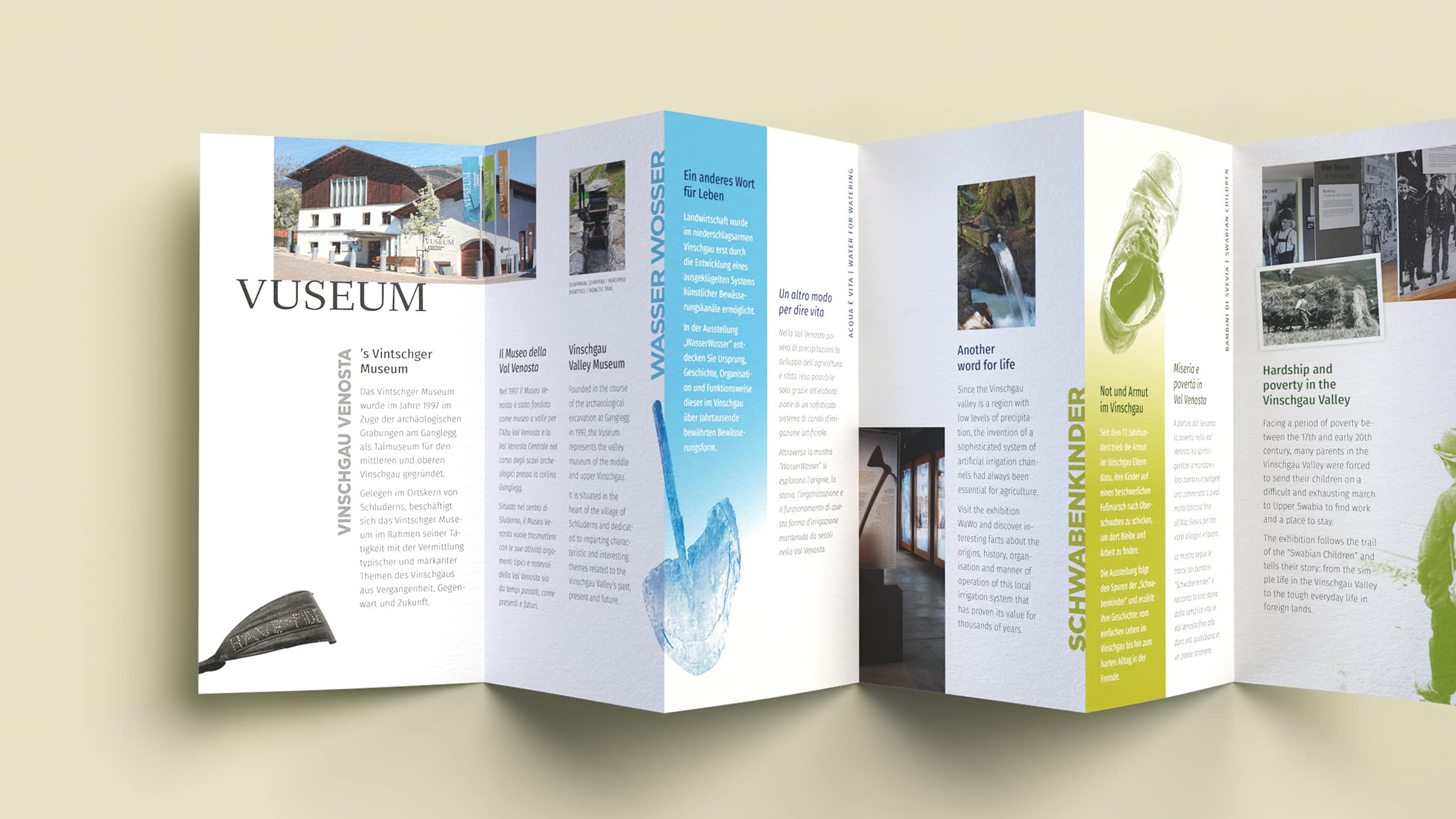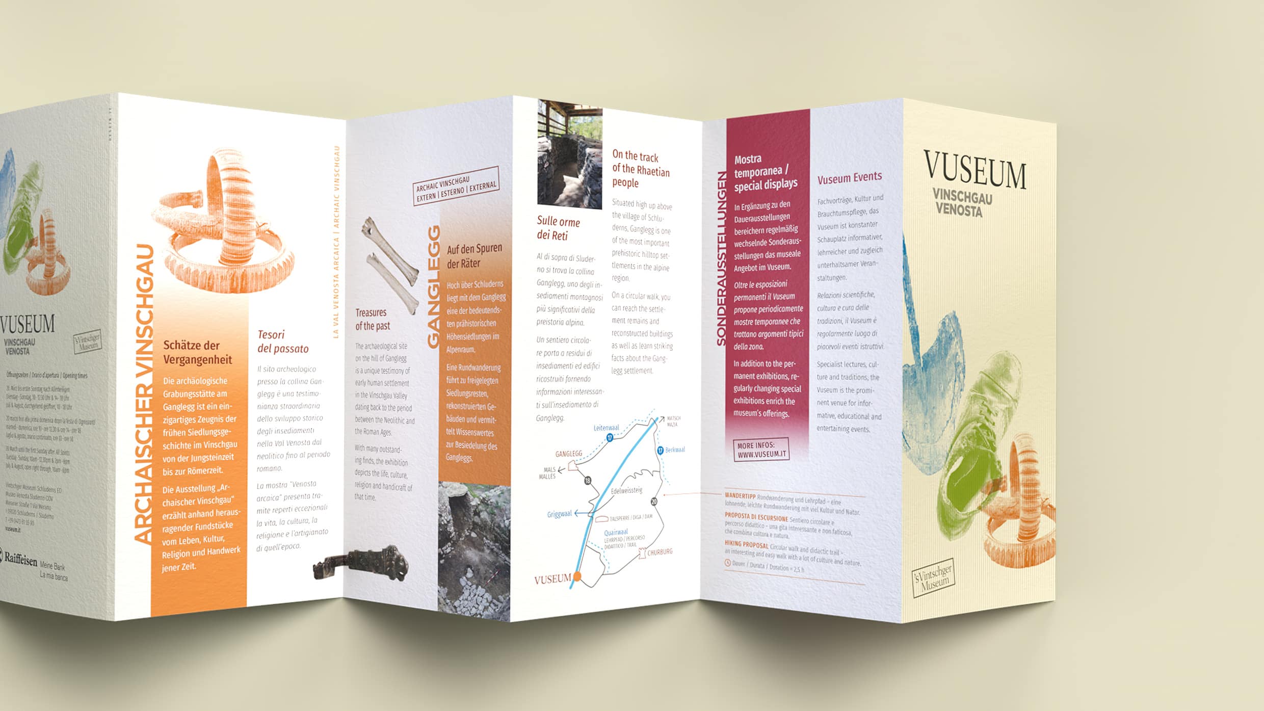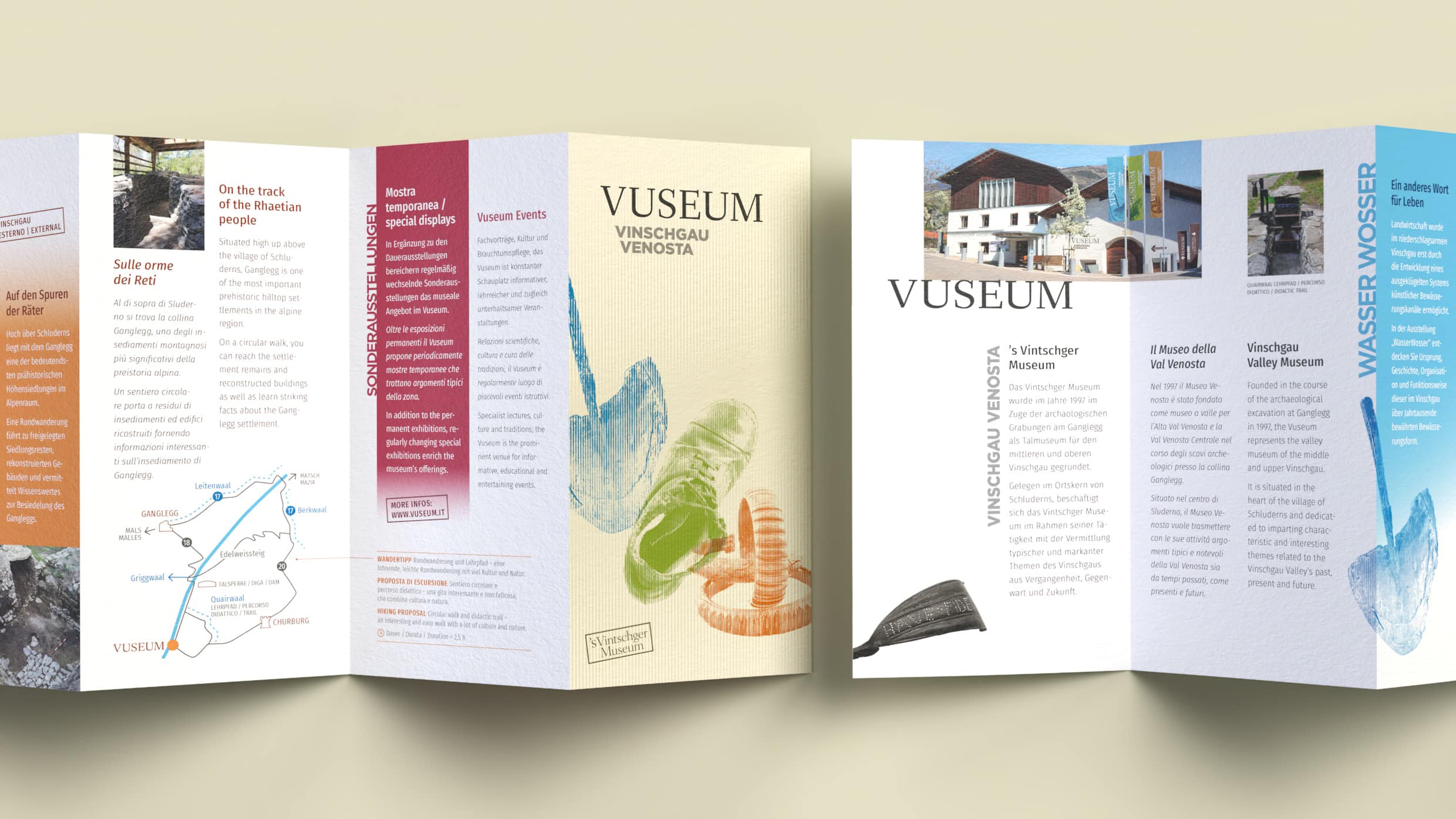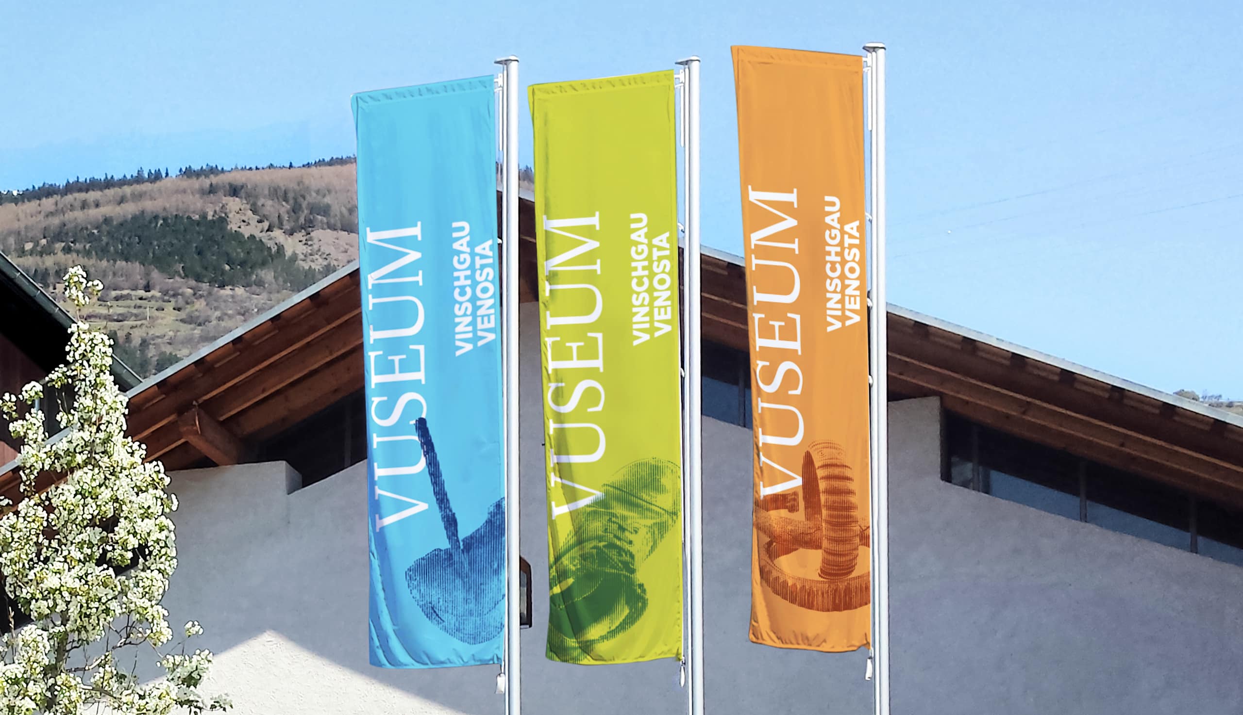 Understanding and experiencing the Venosta Valley. The Vinschgau Museum, established in 1997, is a valley museum for the middle and upper Vinschgau region that covers the past, present, and future of the area. We rebranded the museum by focusing on the Venosta Valley and incorporating it into the new name, VUSEUM, and visually representing its harsh climate with a colorful, rough aesthetic.